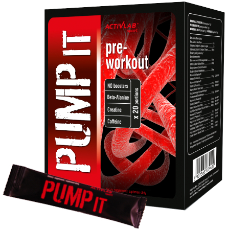 Pump It - передтренувальний комплекс та NO бустер. Зменшує відчуття втоми завдяки бета-аланіну та цитруліну. Включення креатину та L-тирозину підвищує ефективність і продуктивність тренуваннь. L-аргінін та сульфат агматину стимулюють організм до вивільнення оксиду азоту (NO). Додатковий вміст кофеїну сприєя збільшенню витривалості і зниженню ступеню сприйняття навантаження.
